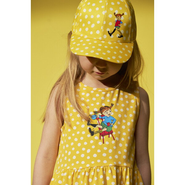 En klassisk Pippi keps för barn. Med förböjd skärm, stadig framdel och ett justerbart kardborreband baktill. Tillverkad i certifierad återvunnen polyester.
