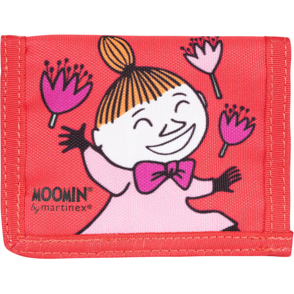 En färgglad Mumin plånbok i stadig polyestercanvas, med glada Lilla My och blommor. Blixtlåsförsedd innerficka för mynt och fack för ID-kort och sedlar. Stängs med kardborreband.