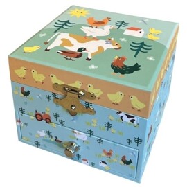 Detta fina smyckeskrin från Trousselier med bondgårdstema är perfekt att förvara sina skatter i.När vredet vrids upp börjar hönan snurra runt till tonerna av Vivaldi - våren.En fin gåva!