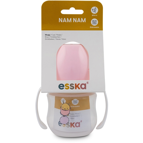 Esskas Nam Nam-mugg är en barnmugg med handtag och täcklock.Nam Nam-muggen passar bra för mindre barnhänder som vill dricka själva, vid matbordet eller i vagnen.
