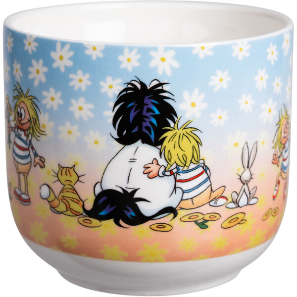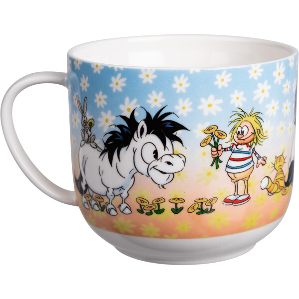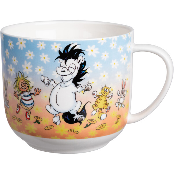 En stor, mjukt rundad temugg i vit keramik med ett glatt Hästen Mulle-motiv av Lena Furberg.