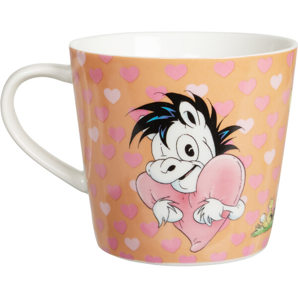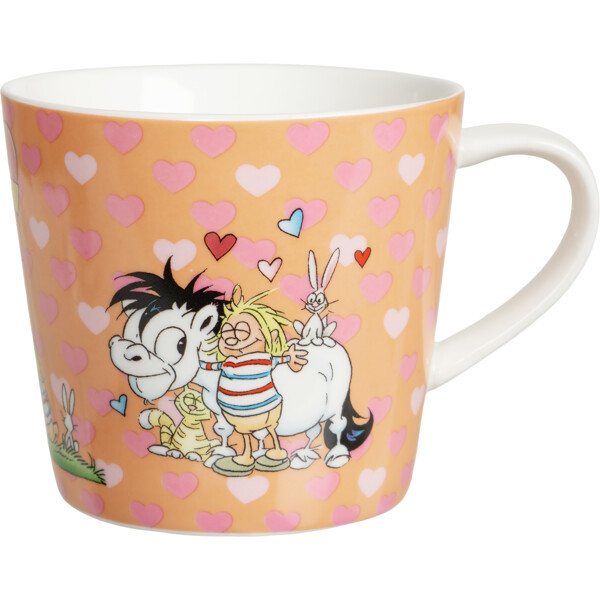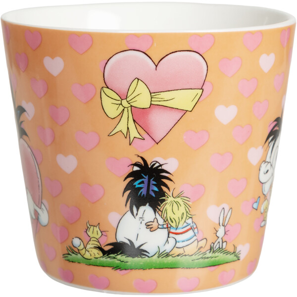 En vit porslinsmugg i rejäl storlek som rymmer 3,5 dl. Utsidan av muggen är helmönstrad i Lena Furbergs söta Hästen Mulle-motiv, där Mulle spenderar tid med sina bästa vänner. I bakgrunden finns små hjärtan i olika nyanser av rosa.