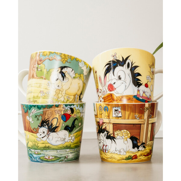 Hästen Mulle Mugg är en samling fina porslinsmuggar med Mulle-motiv. Muggarna är designade av Lena Furberg och de rymmer 3,5 dl. Går att diskas i maskin.