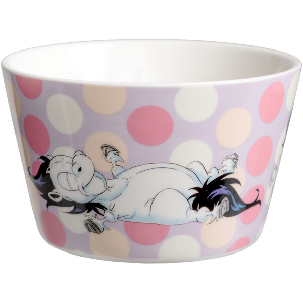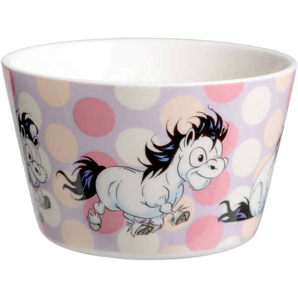 En skål i porslin, med utsidan helmönstrad i Lena Furbergs charmiga illustration av Hästen Mulle.