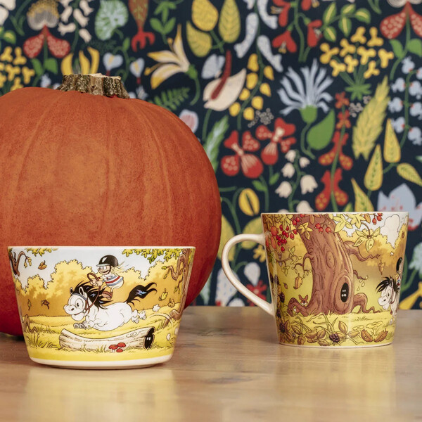 En vit porslinsskål som rymmer 3,5 dl. Utsidan av skålen är helmönstrad i Lena Furbergs härliga höstmotiv av Hästen Mulle på skogstur bland svampar och löv.