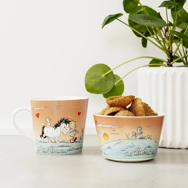 En skål i porslin, med utsidan helmönstrad i Lena Furbergs charmiga illustration av Hästen Mulle.