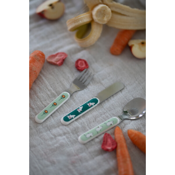 Kniv, gaffel och sked som passar små händer och munnar. Levereras i en fin och praktisk presentkartong.
