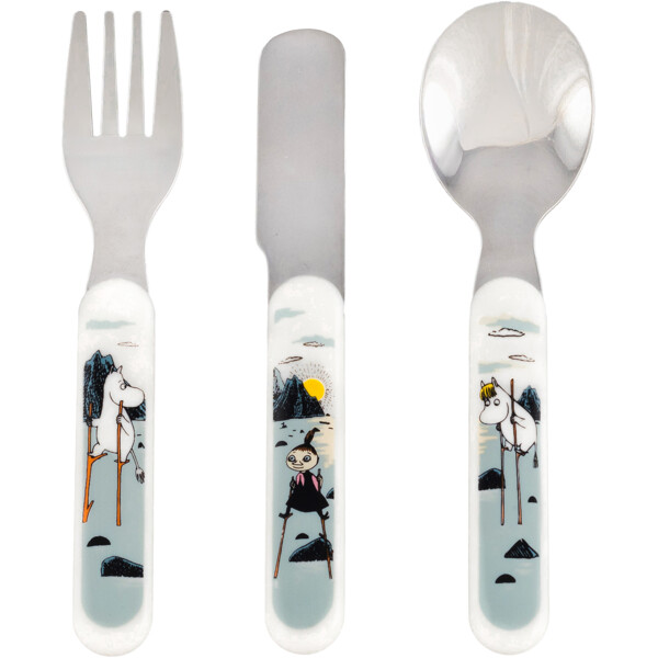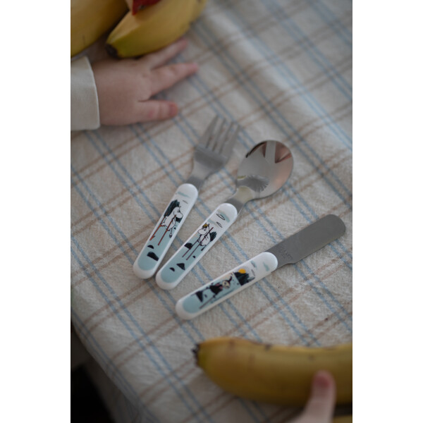 Tåliga barnbestick i ABS-plast och rostfritt stål. Kniv, gaffel och sked som passar små händer och munnar.