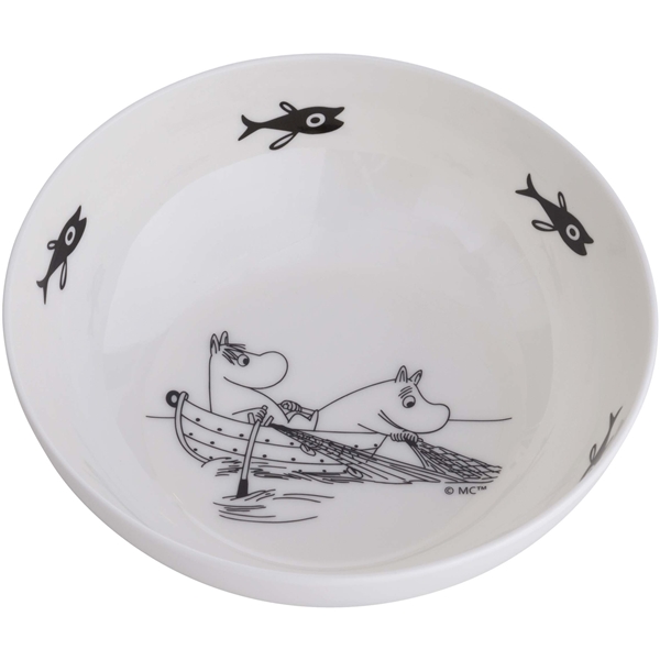 Skålen från Mumin är tillverkad i reptålig melaminplast med ett fint mönster av Mumin och Snorkfröken när de ror en eka och fiskar ute på sjön. Kan diskas i maskin i övre hyllan max 50 grader men tål inte mikrovågsugn. Melamin är en hårdplast som kan spricka vid fall och slag, vid första tecken på sprickor byt ut produkten.