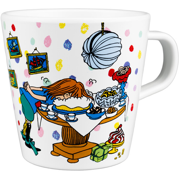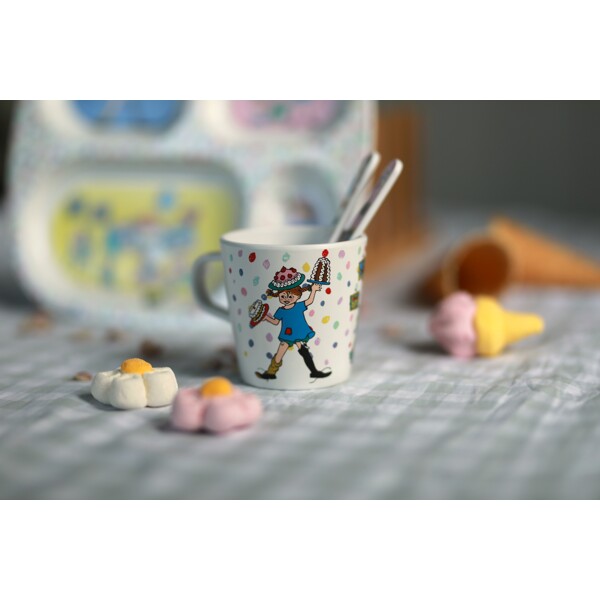 Mugg med ett handtag med Pippi Långstrump-motiv, tillverkad i RPET vilket är ett miljövänligt och tåligt material.