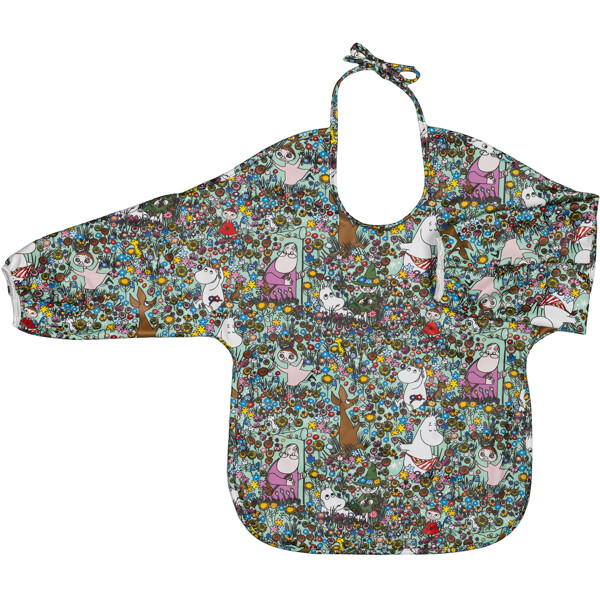 Praktisk haklapp med ärm som kan användas både vid mat och lek med Mumin-motiv.
