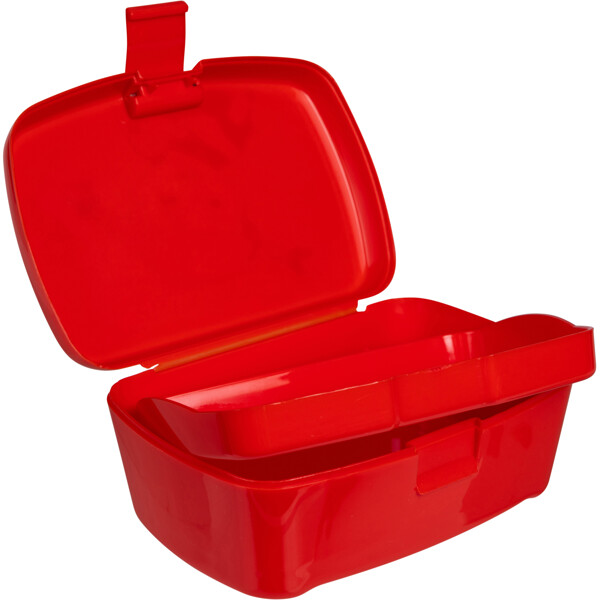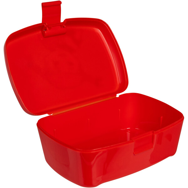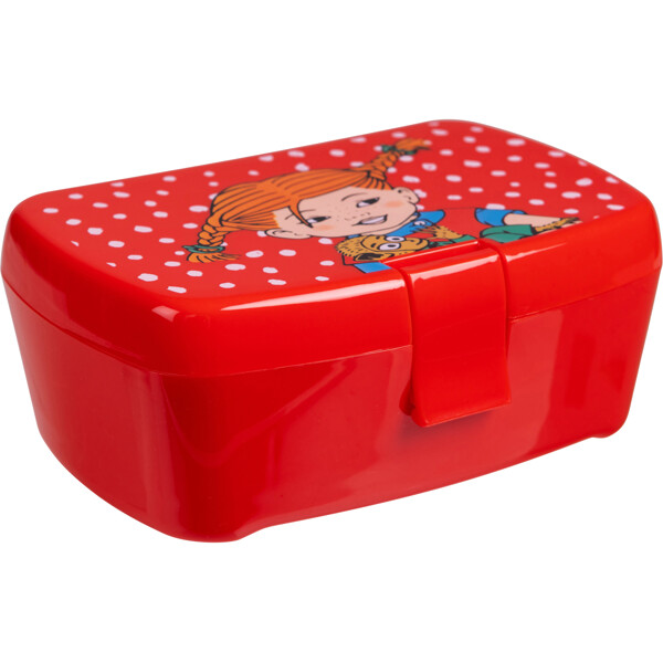 Röd lunchlåda i BPA-fri PP-plast, med gångjärnslock med spänne. Det prickiga locket har ett fint motiv av Pippi Långstrump och Herr Nilsson. Inuti lådan finns en löstagbar avdelare, som är praktisk att använda för att lägga smörgåsen i den nedre delen och bär eller nötter i den övre.