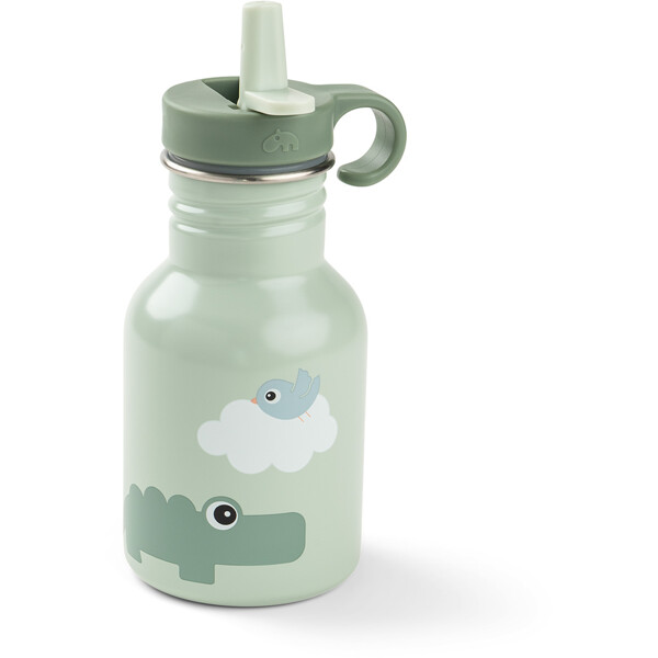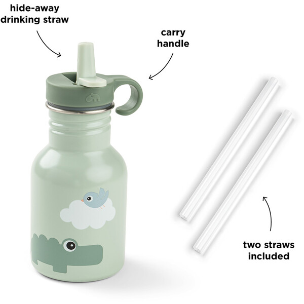 Metallflaskan är robust och har ett praktiskt sugrör som kan fällas ner. Den är perfekt för barnens ryggsäck eller hemma. Flaskan levereras med två sugrör.
