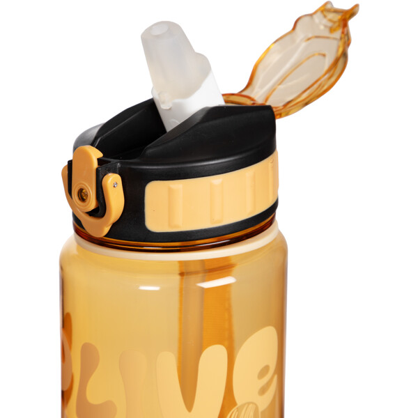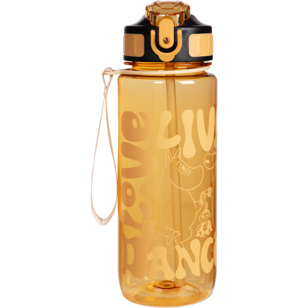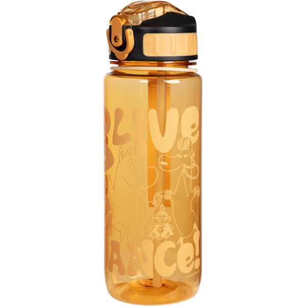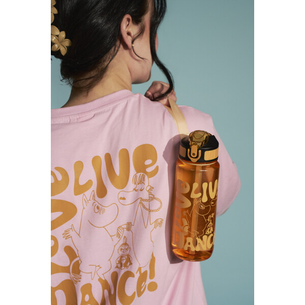 Flaskan har en bärrem, ett tätt lock och ett smidigt sugrör som fälls in under ett litet lock, med en behagligt mjuk drickdel. Den är bekväm att dricka ur, lätt att rengöra och enkel att ta med sig. På flaskan finns en bild av muminfigurer och 'Live, Love, Dance'-text.