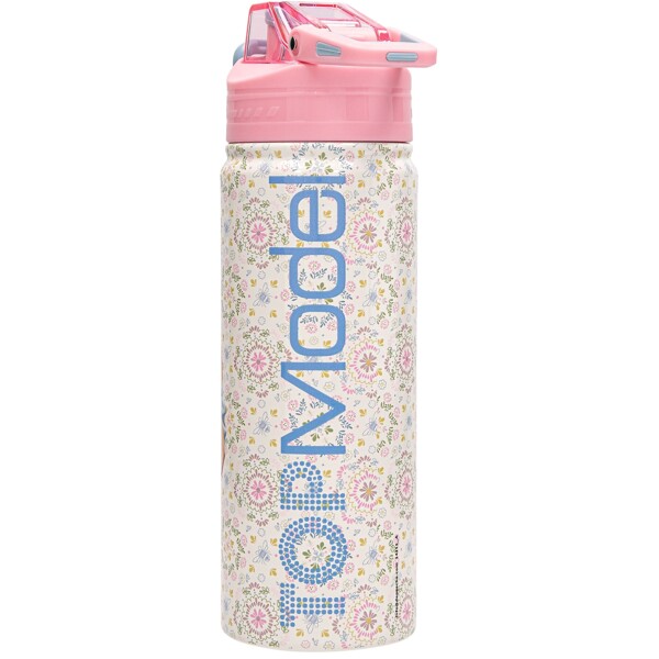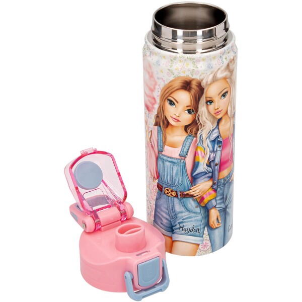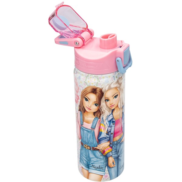En snygg dricksflaska från TOPModel FESTIVAL FUN-serien med ett bedårande blommönster runtom, ett stort motiv av TOPModellerna Hayden och Candy samt vackra rosa och blå detaljer.