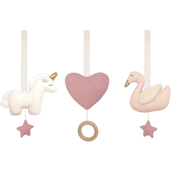 JaBaDaBaDo Babygymfigurer Svan är bedårande leksaker till babygymmet. Setet innehåller ett hjärta, en svan och en enhörning. Hjärtat spelar upp en vaggvisa och svanen har en skallra inuti. Figurernas intressant färger och former underhåller bebisen och är roliga att leka med. De fästs enkelt med kardborre och kan flyttas vart som ni helst vill ha figurerna. De passar till de flesta babygym som finns på marknaden. Figurerna är tillverkade av finaste muslinvävd bomull och fyllningen är polyester fiber.