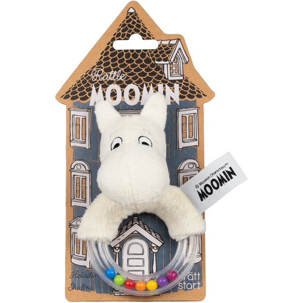 Lekfull skallra med Mumin. Perfekt för att uppmuntra finmotoriska och sensoriska färdigheter. Lätt att greppa och har ett skallrande ljud som stimulerar barnets hörselsinne.