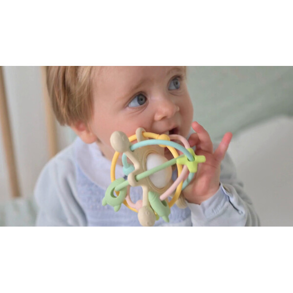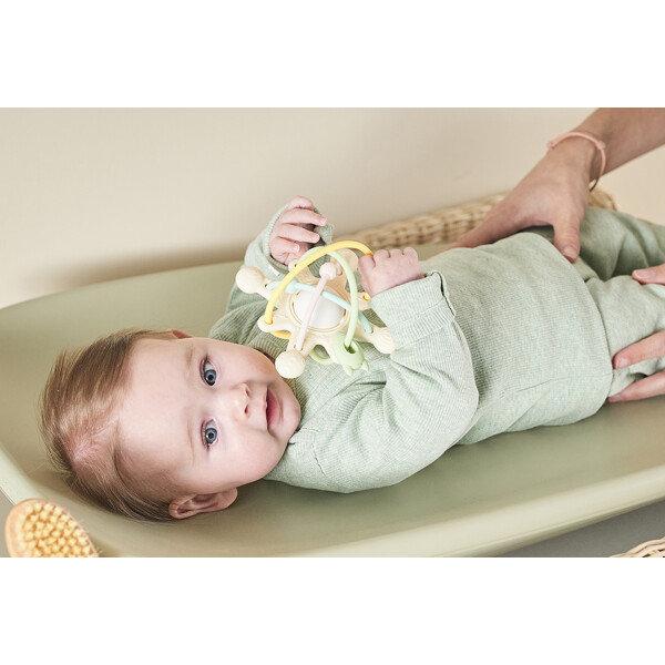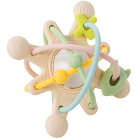 Bitleksak Galaxy ger en massa lekglädje till din bebis och lindrar även obehag vid tandsprickning. Den söta designen med stjärnor och planeter uppmuntrar din bebis att utforska, bita och suga på de många detaljerna och strukturerna. I mitten finns en sol med skallra. Den genomtänkta formen är perfekt anpassad för små händer och främjar utvecklingen av din bebis gripreflex och finmotorik.Bitvänlig mjuk leksak med skallraFrämjar finmotorikenUtformad för små händerBPA-fri silikonRengör med tvål och vattenStorlek: 12 x 12 x 9 cm
