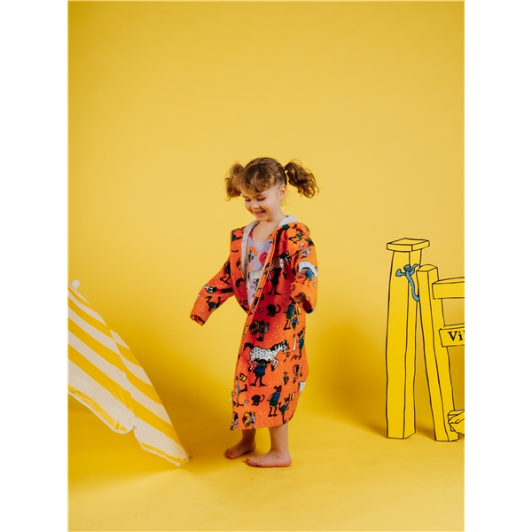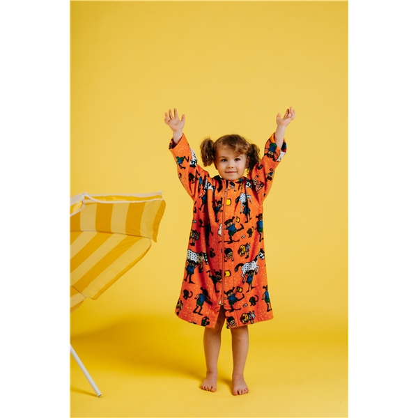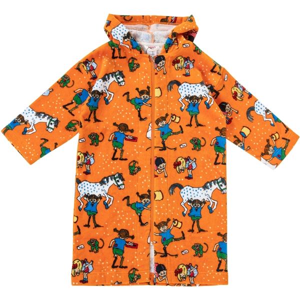 En varmt orange badrock med roligt Pippi Långstrump mönster. Badrocken är mjuk och skön och sydd i ett stycke, utan sidsömmar. Den har huva, upphängningsögla i nacken och blixtlås framtill.