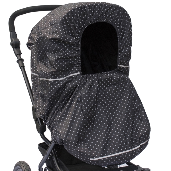 Med Vinter & Bloom Regnskydd Ebony Black kan njuta av sköna barnvagnspromenader! Vinter & Bloom regnskydd skyddar både ditt barn och din vagn från regn och kalla vindar. Det här är ett regnskydd som du inte vill vara utan. Det passar till både barnvagn och sulky. Fönsterrutan med ventilationshål gör promenader både roliga och bekväma för barnet även under kalla och blåsiga dagar. Regnskyddet är vind- och vattentätt i ett snabbtorkande material. Tydliga reflexband på sidorna och framtill gör att ni syns bättre när det är mörkt och du har det alltid lättillgängligt då fodralet enkelt fästs på barnvagnen. Regnskyddet är en del i Vinter & Blooms kollektion Mini Dots, som kännetecknas av sin tidlösa och praktiska design. I kollektionen finns även åkpåse och sittdyna.Passar både barnvagn och sulky Avtagbart fönster med tryckknappar 100% PU-belagd polyester Maskintvätt 40°C