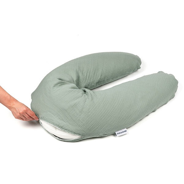 Doomoos kombinerade gravid- och amningskudde Muslin har fler smarta funktioner. Den kan även användas som ett skönt liggstöd till barnet, både när det ligger på mage och på rygg samt som ett säkert sittstöd, som en ”lära sitta-kudde”. Den fungerar även utmärkt som läskudde för både barn och vuxna.