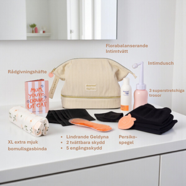 Innehåll – 8 viktiga produkter för BB-väskan:Intimdusch – skonsam rengöring under och efter förlossningenXL extra mjuk bomullsgasbinda – GOTS- och Oeko-Tex-certifierad, för hög komfort3 superstretchiga trosor – passar storlek 36–52, håller skydd på platsLindrande Geldyna – lindrar och ger skön avlastning2 tvättbara skydd + 5 engångsskydd – alla Oeko-Tex-certifierade för trygg användningDoomoo Shinncare Florabalanserande Intimtvätt– hjälper till att hålla intimområdet fräscht och balanseratPersikospegel – våga titta och ta hand om ditt intimområde med kärlekRådgivningshäfte – tips och stöd för att frigöra tankarna och minska stressen