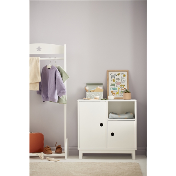 Kids Concept Skåp Star Vit är ett fint förvaringsskåp till barnrummet i trä. Förvaringsskåpet har tre sektioner, en öppen och två med lucka i två olika storlekar. I den vänstra sektionen finns två justerbara hyllplan. Förvaringsskåpet har fäste på baksidan som går att montera i väggen för att minska risken för att skåpet ska tippa.