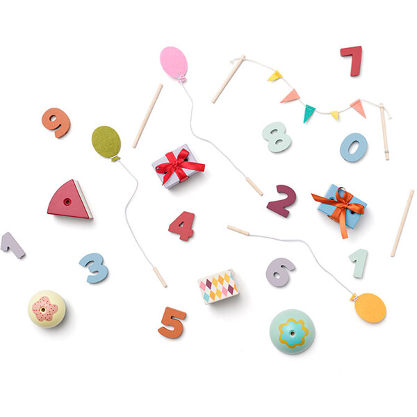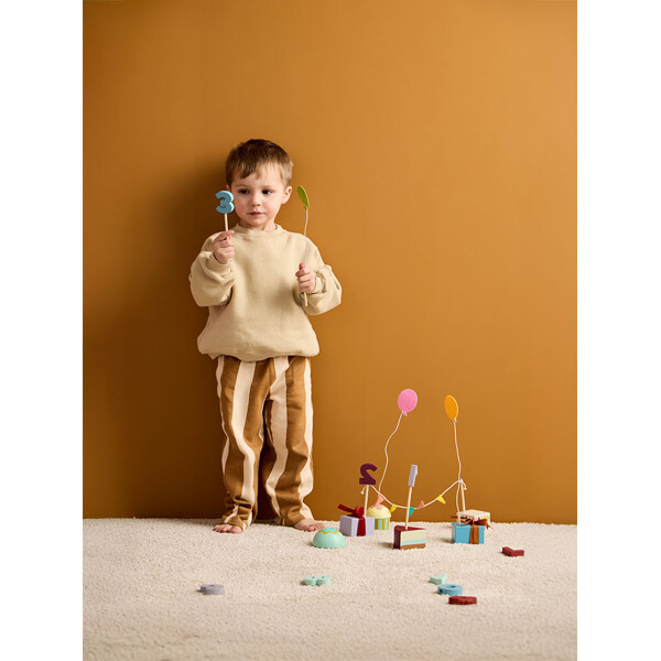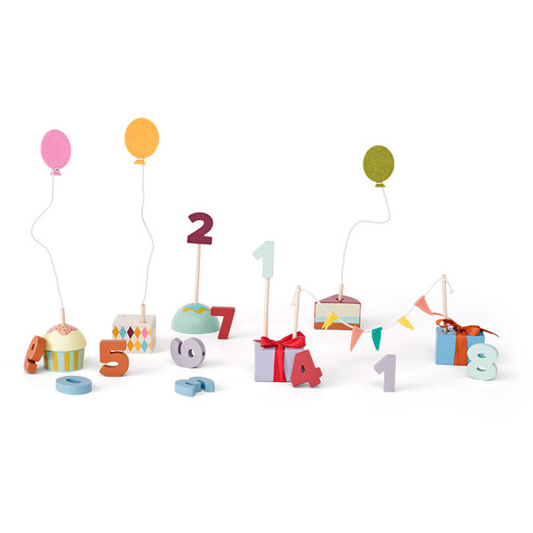 Varje figur har ett nummer för att markera födelsedagsbarnets ålder. Setet kommer med siffrorna 0 till 9 samt en extra siffra 1, vilket gör att det kan användas vid flera födelsedagar. Två ballonger i filt på metalltrådar ger en extra dekorativ detalj. En papplåda ingår också, där alla delarna kan förvaras och tas fram år efter år.