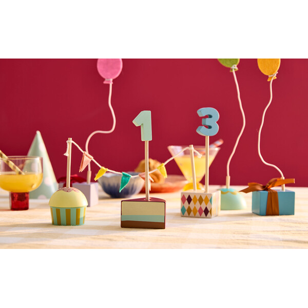 Denna bordsdekoration i trä för födelsedagar innehåller figurer som föreställer tårtor, cupcakes och små presenter.