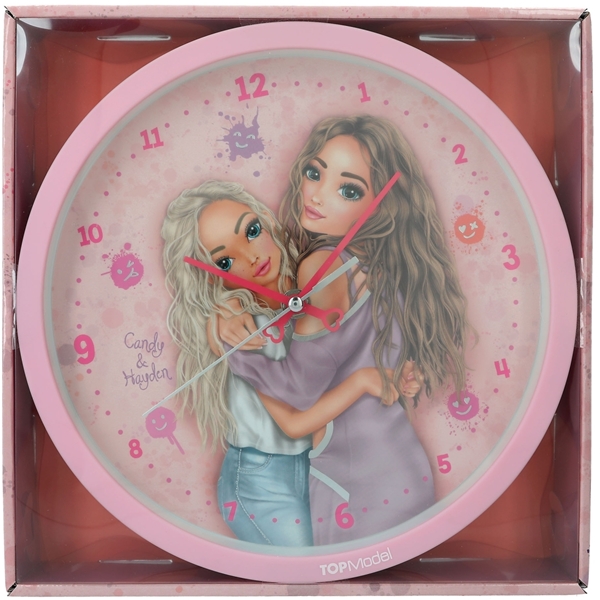 Vad är klockan? Det är TOPModel tid! Den snygga väggklockan från serien Happy Together har ett vackert modellmotiv och söta smileys på urtavlan. En söt detalj är hjärtana på visarna. Klockan har en diameter på 24,5 cm och visar tiden helt ljudlöst. Förpackad i en vacker rosa presentförpackning och pryder de flesta rum. Batteridriven, AA-batteri ingår.