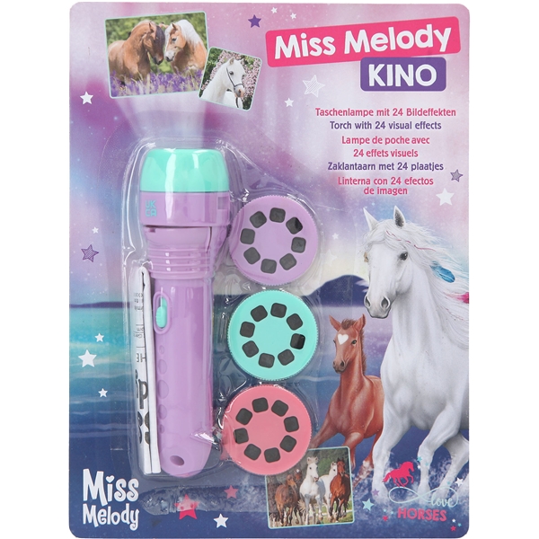 Den lila ficklampan är inte bara till för att lysa upp mörkret, den fungerar även som projektorlampa. Genom att sätta i ett av de tre projektorhjulen kan du visa vackra hästbilder på väggen eller i taket.