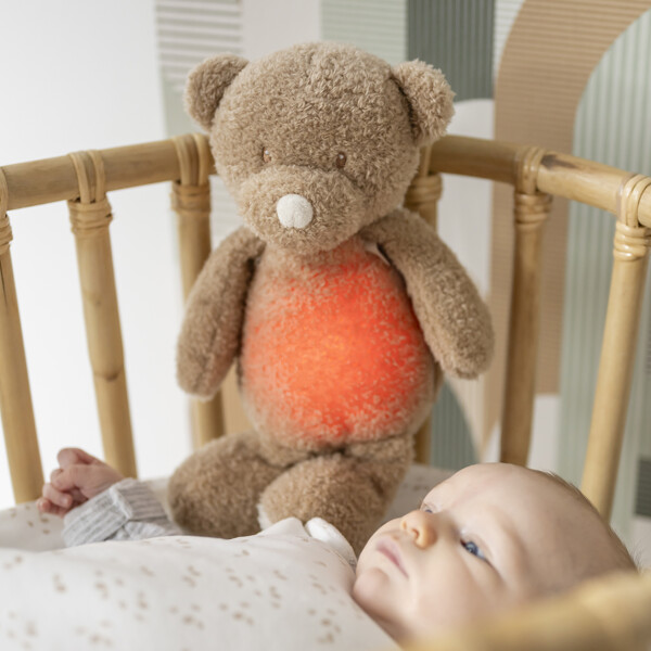 Denna söta nattlampan med sin fina päls erövrar alla bebisars hjärtan. Med sina många grepppunkter som öron, armar eller halsduk erbjuder gosedjuret gott om möjligheter att främja motoriken och känseln. Den integrerade nattlampan med sina 7 naturliga färgtoner och en speldosa med vitt brus, hav, hjärtslag och vaggvisa har en lugnande effekt och främjar därmed barnets fridfulla somnande. Dessutom har gosedjuret ett detekteringsläge som spelar mjuka melodier i 15 minuter när barnet börjar gråta.Söt design med öron, tassar och svans för att gripa, leka och gosaIntegrerad nattlampa med 7 färger och speldosa med lugnande melodierUpp till 8 timmars autonomi och automatisk detektering när barnet gråterMaterial: plysch 100% polyesterStorlek: 19 x 10 x 33 cmLampan är inte tvättbar, Överdraget är maskintvättbar i 30°C