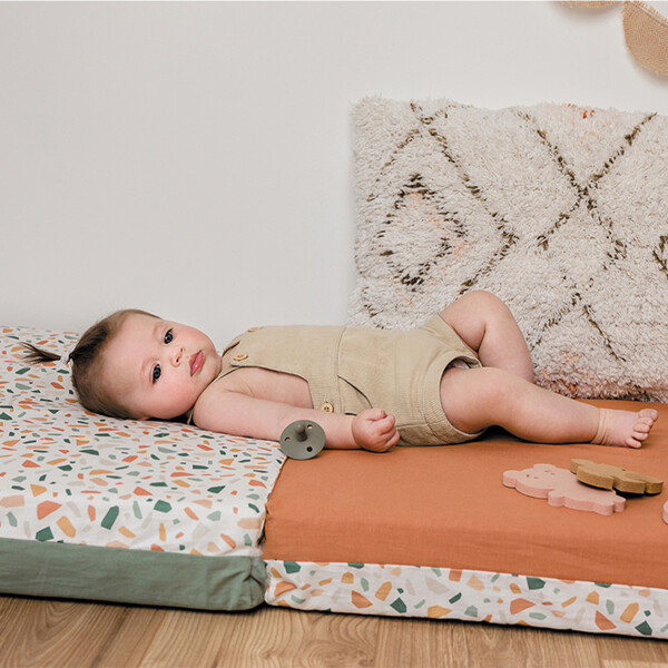 En stor och multifunktionell lekmadrass från Candide som erbjuder en stor aktivitetsyta för barnet att leka, ligga och sitta på.Lekmadrassen är 120×120 cm när den är helt utfälld och fungerar då som en stor och mjuk lekyta för barnet att leka på.Viker man lekmadrassen i 2 delar fungerar den som en extrasäng 120 x 60 x10 cm. Viker man den i 3, förvandlas den till en sittpuff med mått 60 x 60 x 20 cm.Madrassen kan även användas som en soffa genom att sätta den mot en vägg med 2 delar upp mot väggen.Överdraget är avtagbart och tvättas i maskin på 30 grader.