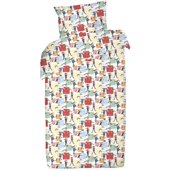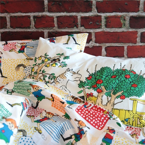 Bäddset Pippi Långstrump är ett bäddset till barnsängen som är 150x 200 cm. Bäddsetet är vitt och helmönstrat av fina Pippi-motiv med färger och former i rött, grönt, blått, gult och orange med Pippi, Herr Nilsson och Lilla Gubben.