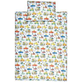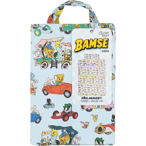 Påslakan och örngott med Bamsemotiv. Tillverkat i bomull.