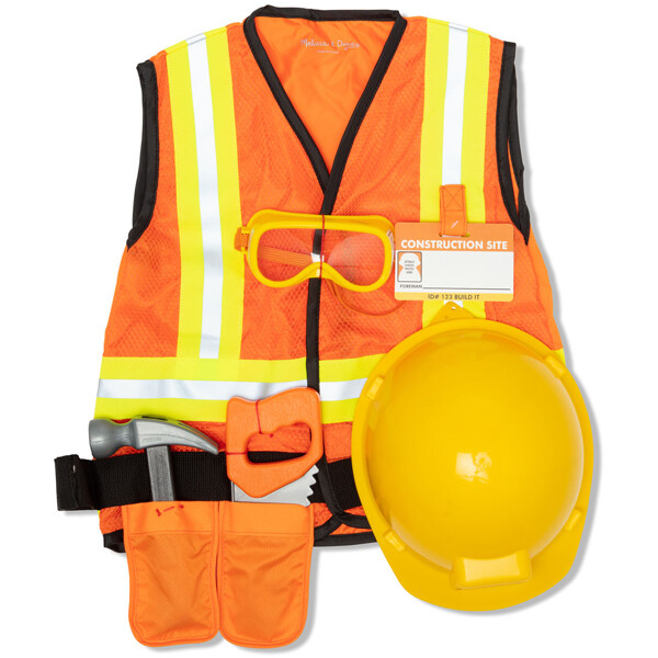 Setet innehåller en ljusorange väst med reflexmaterial, ett verktygsbälte, en gul hjälm, skyddsglasögon, en hammare, en såg och en namnskylt för personlig anpassning. Dräkten är dimensionerad för att passa barn i åldern tre till sex år och är tillverkad av högkvalitativa tyger som säkerställer att den tål upprepad användning.