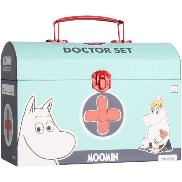 Mumins doktorväska till den lilla läkaren hemma hos er. Väskan innehåller ett riktigt stetoskop när barnet kan lyssna på hjärtslag, ett hårnät, munskydd, bomullshandskar, bandage, kompresser, termometer, spruta och en hammare för att undersöka reflexer med. Det finns allt som behövs för att göra undersökningar precis som en riktig doktor.
