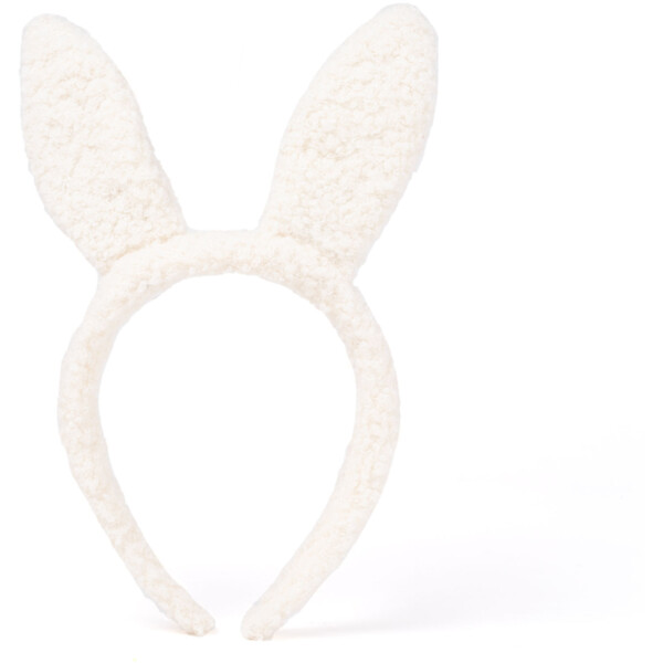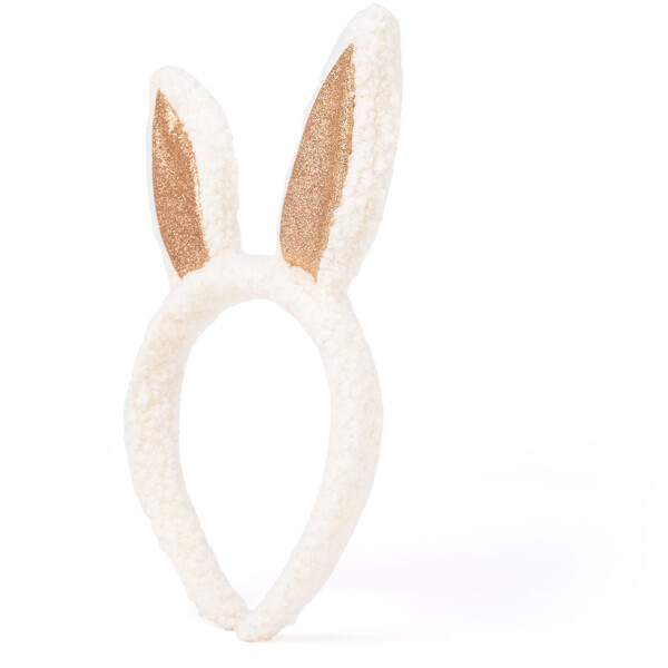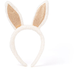 Mjukt diadem med vita kaninöron och glittriga gulddetaljer.