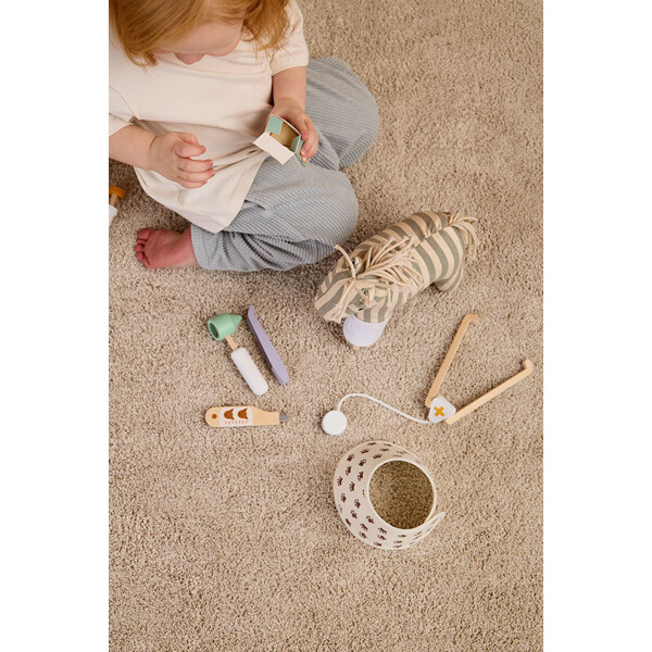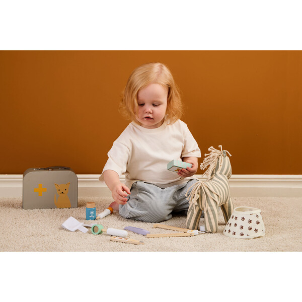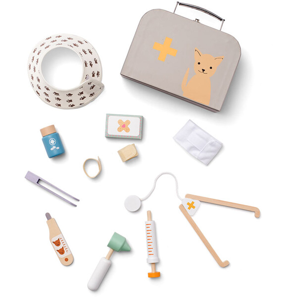 Detta veterinärset är perfekt för barn som gillar att ta hand om sina mjukisdjur. Setet innehåller en spruta, en medicinflaska, fiskformad "kattmat", ett stetoskop, en termometer, pincett och en tygkrage för att hindra djuren från att slicka sina sår efter operation. Det ingår också ett öroninspektionsverktyg, ett otoskop, för att kolla på djurens hälsa.