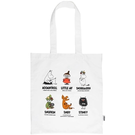 Fin och praktisk tygkasse i stadigt canvastyg tillverkat av återvunnen bomull och återvunnen polyester. Framsidan av kassen dekoreras av Muminfigurer i färg. De stadiga handtagen kan bäras i handen eller över axeln. Perfekt för dig som vill minska på användningen av plastpåsar.