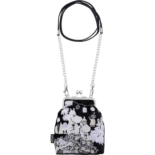 En fin, liten axelremsväska i polyestercanvas med len velouryta, sydd med bottenflik 14 x 4 cm, vilket gör den lilla väskan härligt rymlig. Väskan är svart och helmönstrad med muminfigurer på mysig skördefest i trädgården i vit, grå och ljusblå brodyr. Insidan är fodrad i svart och upptill finns det ett 10 cm brett lås i metall. Den festliga, löstagbara axelremmen börjar som en metallkedja för att sedan övergå i svart textil. På den svarta etiketten i sidsömmen står det Moomin by Martinex.