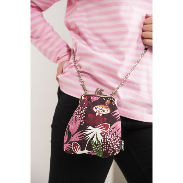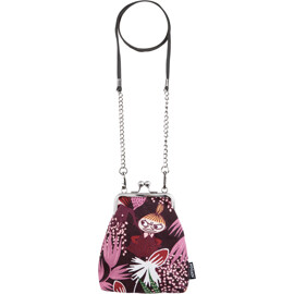 En liten muminväska i stadig bomullscanvas. Den löstagbara axelremmen (130 cm) är delvis tillverkad i metall. Upptill har väskan ett lås med knäppe i metall.