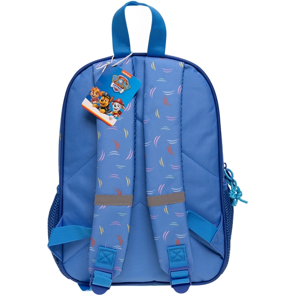 En ryggsäck med Paw Patrol design. Ryggsäcken har ett stort fack och en framficka som båda stängs med dragkedja. Väskan har två sidfickor i meshtyg och vadderade axelband. Axelremmarna är försedda med reflexer för att barnet ska synas bättre i mörkret.