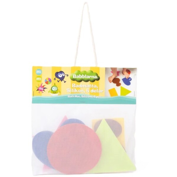 Med olika former och färger blir badet en lekfull och lärorik stund där barnet kan utforska och öva på språket tillsammans med Babblarna. Detta 6-pack badmattor gör varje badstund spännande och trygg.