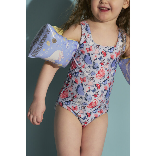 En skön Mumin baddräkt för barn. Baddräkten är fodrad framtill, hög i ryggen med breda och stadiga axelband. Tillverkad av elastisk, snabbtorkande polyesterblandning.