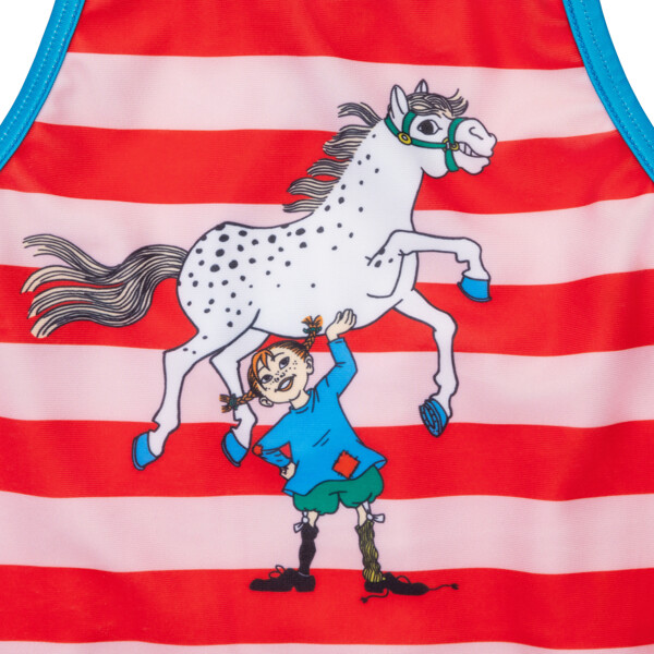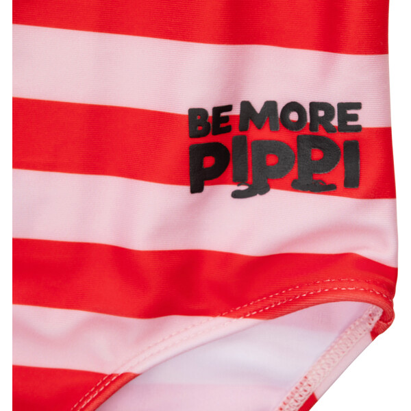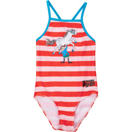En rolig randig Pippi baddräkt för barn. Baddräkten är fodrad framtill, den är hög i ryggen och de tunna, korslagda axelbanden åker inte ned över axlarna. Tillverkad av elastisk, snabbtorkande polyesterblandning.