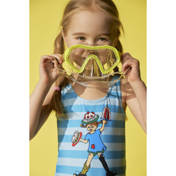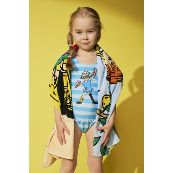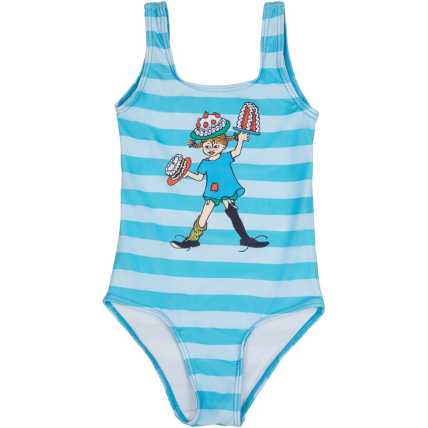 En fin Pippi baddräkt för barn. Baddräkten är fodrad framtill, hög i ryggen med breda och stadiga axelband. Tillverkad av elastisk, snabbtorkande polyesterblandning.