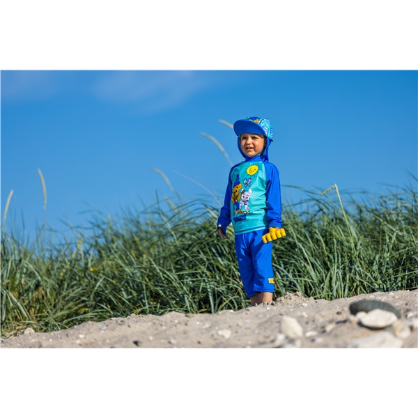 UV-Tröja från Swimpy med Bamse-motiv. Kläderna från Swimpy är elastiska, sköna och snabbtorkande, lämpliga i både sol och vatten. Plagget har ett certifierat UV-skydd motsvarande UP50+. Det är tygets täthet och struktur som ger skyddet och UV-skyddet håller så länge plagget är helt. Dragkedja i halslinningen gör det enklare att få på och av tröjan.