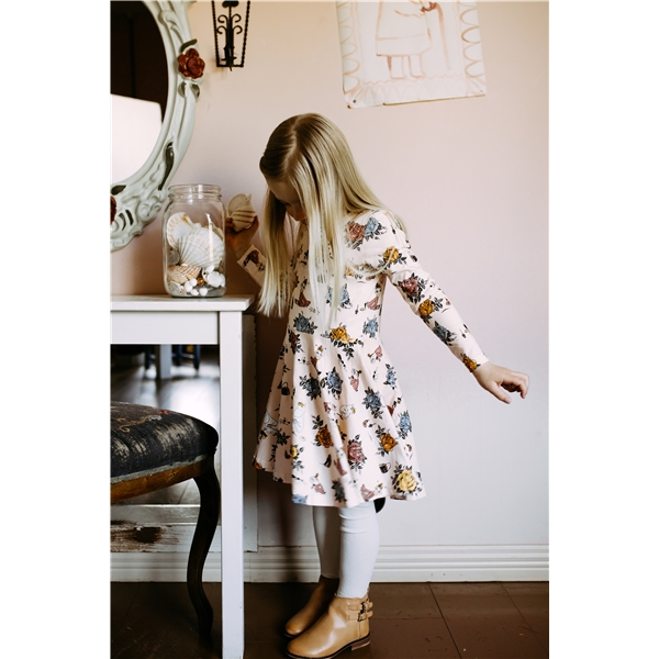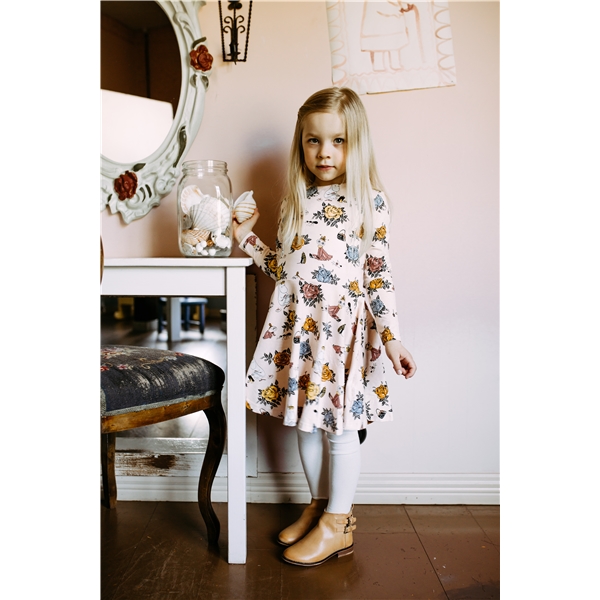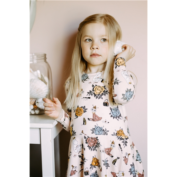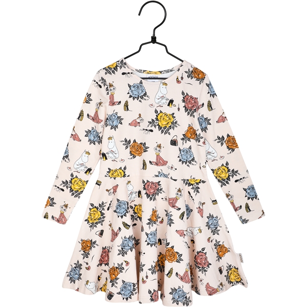Mumin Rosor Klänning Rosa är en långärmad klänning i beigerosa. Klänningen är helmönstrad med Mymlan, Snorkfröken och Lilla My samt rosor i blått, gult och rosa. Kjoldelen är klockad och ger en extra fin effekt vid snurr.