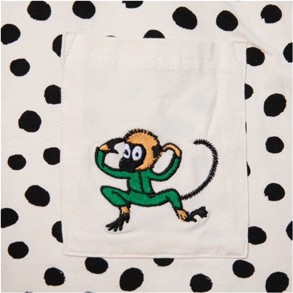 En rolig prickig Pippi-klänning för barn. A-linjeklänningen har korta ärmar och två broderade lappade fickor på fållen. Klänningen är gjord med GOTS-certifierad organisk bomullsblandning.